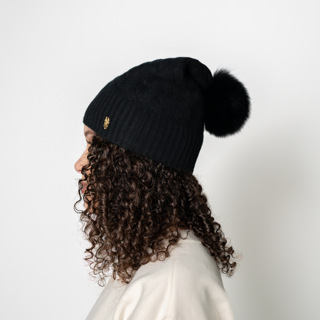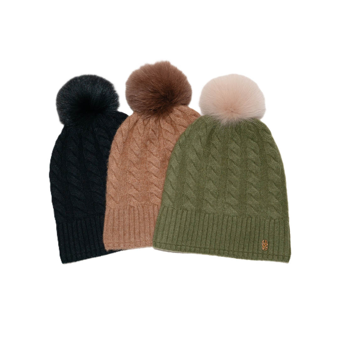 Yes! Every Cable Knit Beanie features a detachable faux-fur pom that buttons on and off easily from the inside so you can change your look, wash the beanie without the fur poof (very important), or swap poms between styles. (Because your winter hair styles deserve options😉)