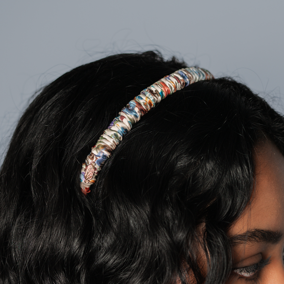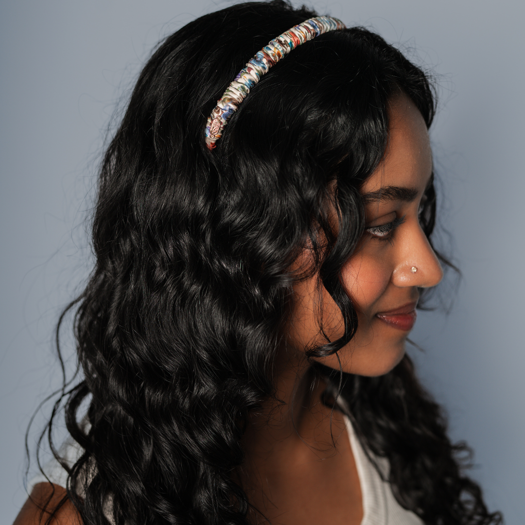 No squeeze. No stress. No plastic. No headaches. No drama—just effortless style. Made from plant-based acetate (never plastic) and wrapped in 100% Mulberry silk to pamper your hair, fight frizz, and keep breakage far, far away. Its clever curve plays nice with your sunnies and eases tension for all-day comfort. Comes with its BFF, The Headband Trainer—so you can either let it loosen up over time or pop it on after each wear to keep your headband snatched for the long haul. Luxe look, headache-free fit, healthy hair, and planet approved.