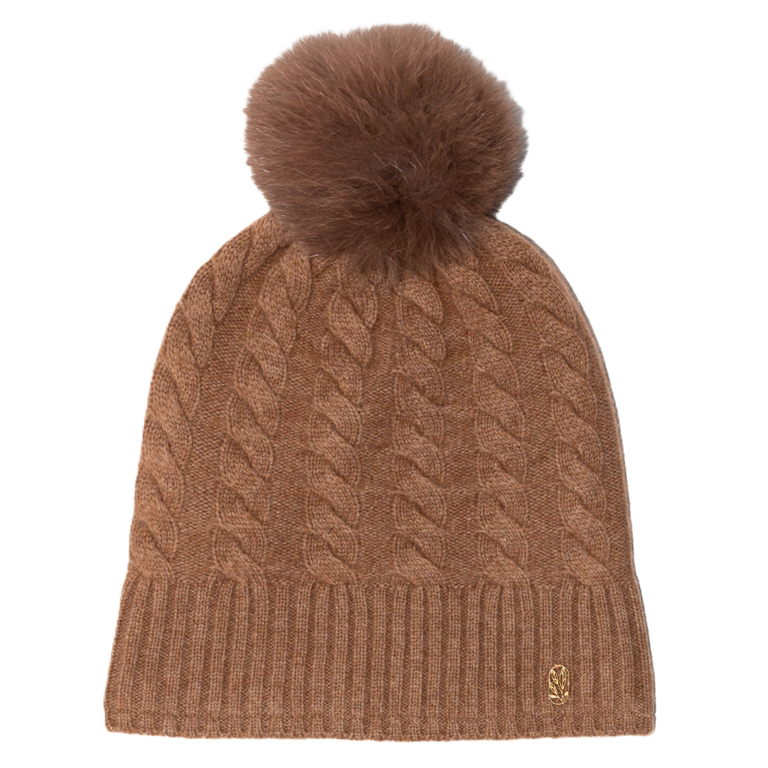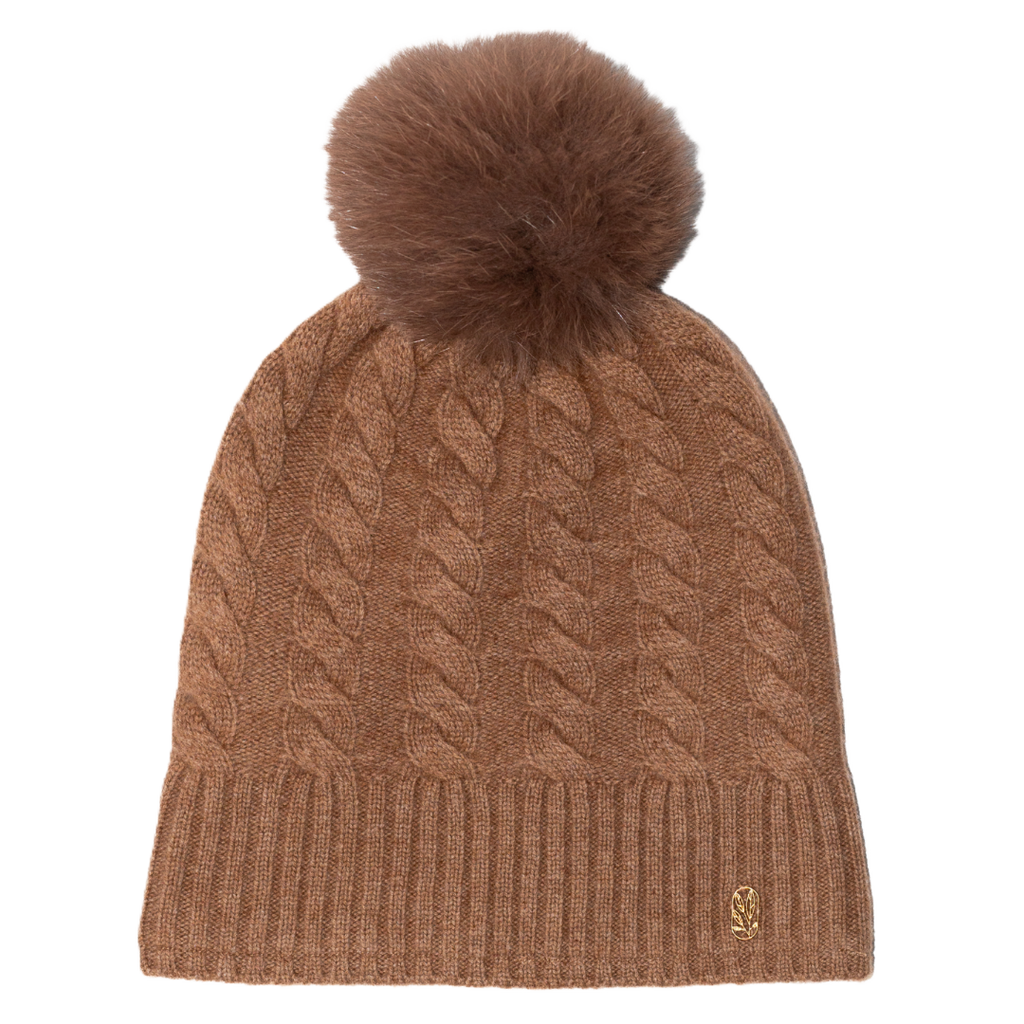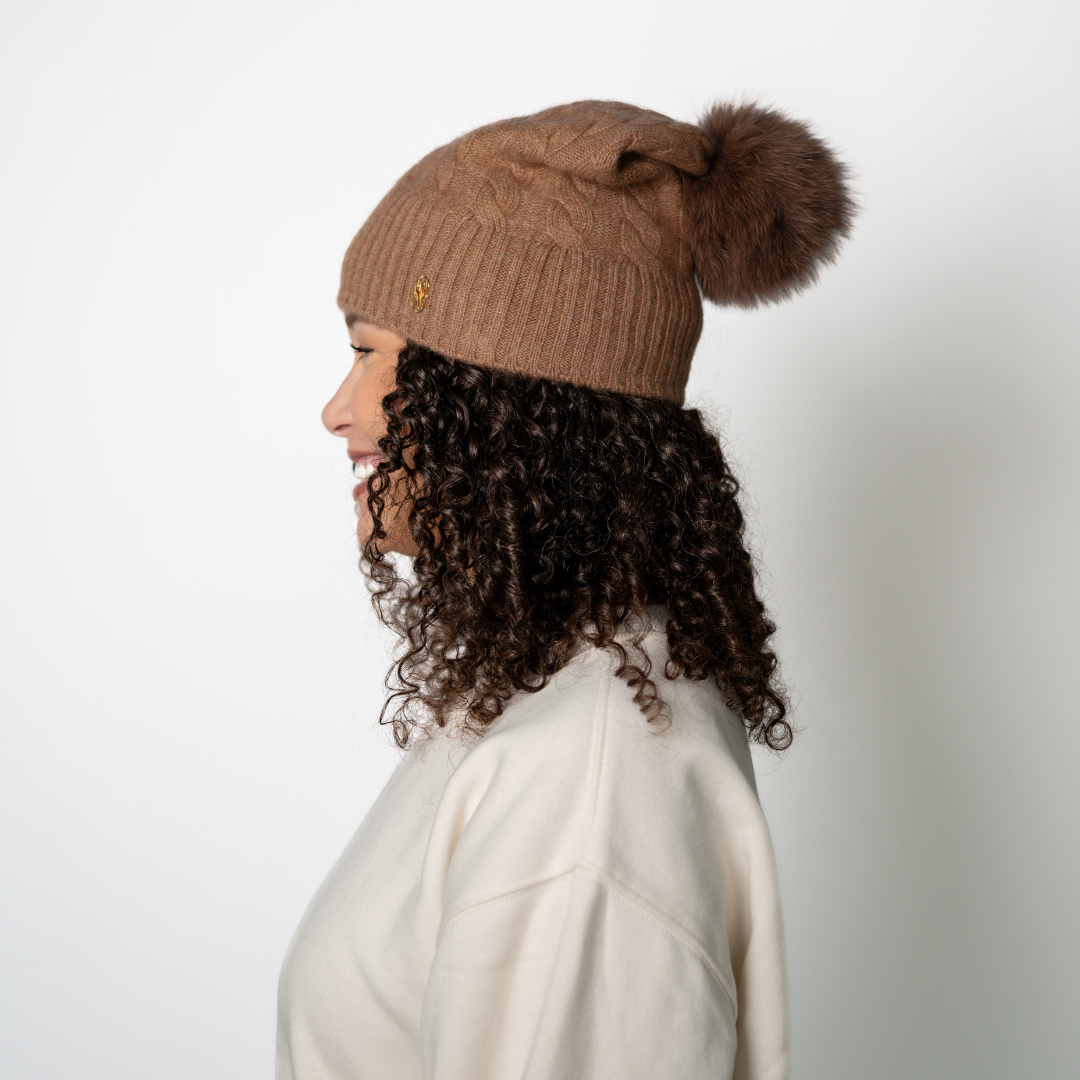 Spot clean when possible or hand wash separately with wool/cashmere safe detergent and lay flat to dry. Always remove any detachable fur poms before cleaning (check the interior button), and NEVER toss them in the dryer.